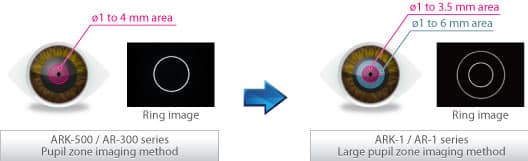 El método de formación de imágenes zona de pupila grande permite la medición de área amplia refracción de hasta 6 mm de diámetro y puede indicar la diferencia entre la refracción amplia zona y la zona central de refracción de hasta 3,5 mm de diámetro.