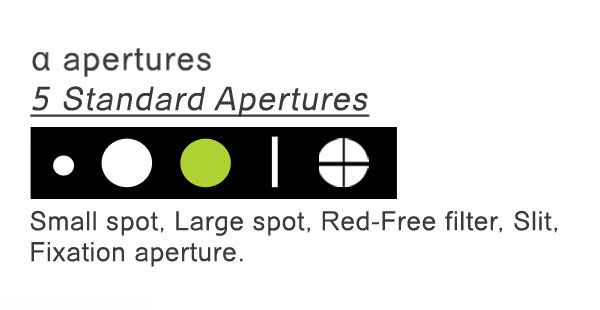 Existe una amplia gama de prácticas aberturas y filtros para seleccionar en el EZER EZ-OPH-1800: punto pequeño, punto grande, semipunto, filtro libre de rojo y abertura de fijación. Esta selección de aberturas, cubre todas las necesidades básicas del profesional en su consulta cotidiana.