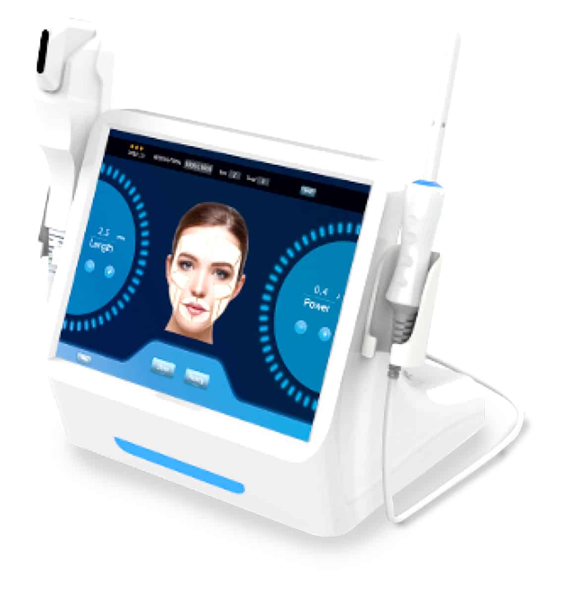 HIFU, ultrasonido enfocado de alta intensidad, lo que permite que la energía se concentre en la capa de colágeno y la capa de fascia (SMAS) produce una reacción de coagulación de la proteína en el SMAS enfocado y la fuerza de tracción produce un centrado en el punto de congelación. Como resultado, se realiza la recombinación de colágeno y el recién generado puede tensar y levantar la piel desde el interior.